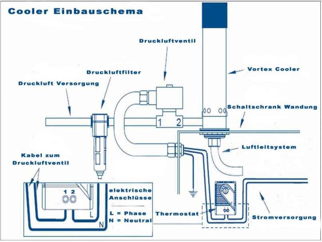 Diese Vortex Cooler werden mit einem empfindlichen elektrischen Thermostat (+/- 1°C Regelintervall) und Magnetventil für die Druckluftleitung geregelt, womit eine genaue Temperaturregelung innerhalb des Schaltschrankes möglich ist und die Druckluft-Zufuhr nur bei Erfordernis freigegeben wird. Der Thermostat ist ab Werk auf 32°C eingestellt, kann aber auch manuell auf die gewünschte Zieltemperatur justiert werden.